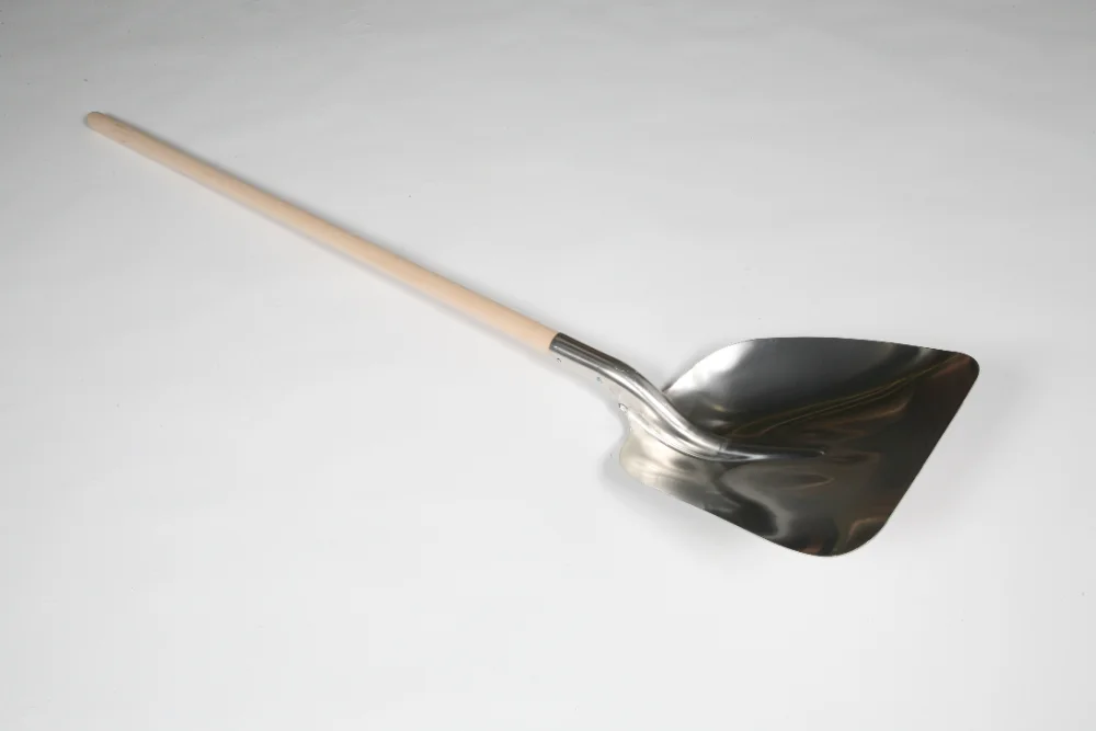 Aluminium anticorrosion ép. 2,45 mm Dim. pelle : 370 x 430 mm (l x H) Manche hêtre 120 cm, ø 38 mm Poids : 1,6 Kg emmanché